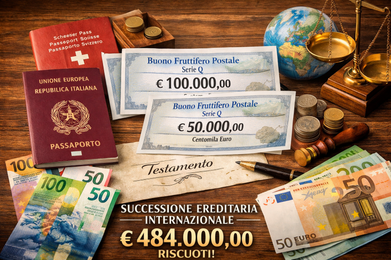 Si è recentemente conclusa positivamente una lunga e complessa pratica di successione ereditaria internazionale, avente ad oggetto buoni fruttiferi postali per un valore complessivo di € 𝟒𝟖𝟒.𝟎𝟎𝟎,𝟎𝟎, lasciati da un parente residente in Svizzera a favore di eredi residenti in Italia e all’estero.